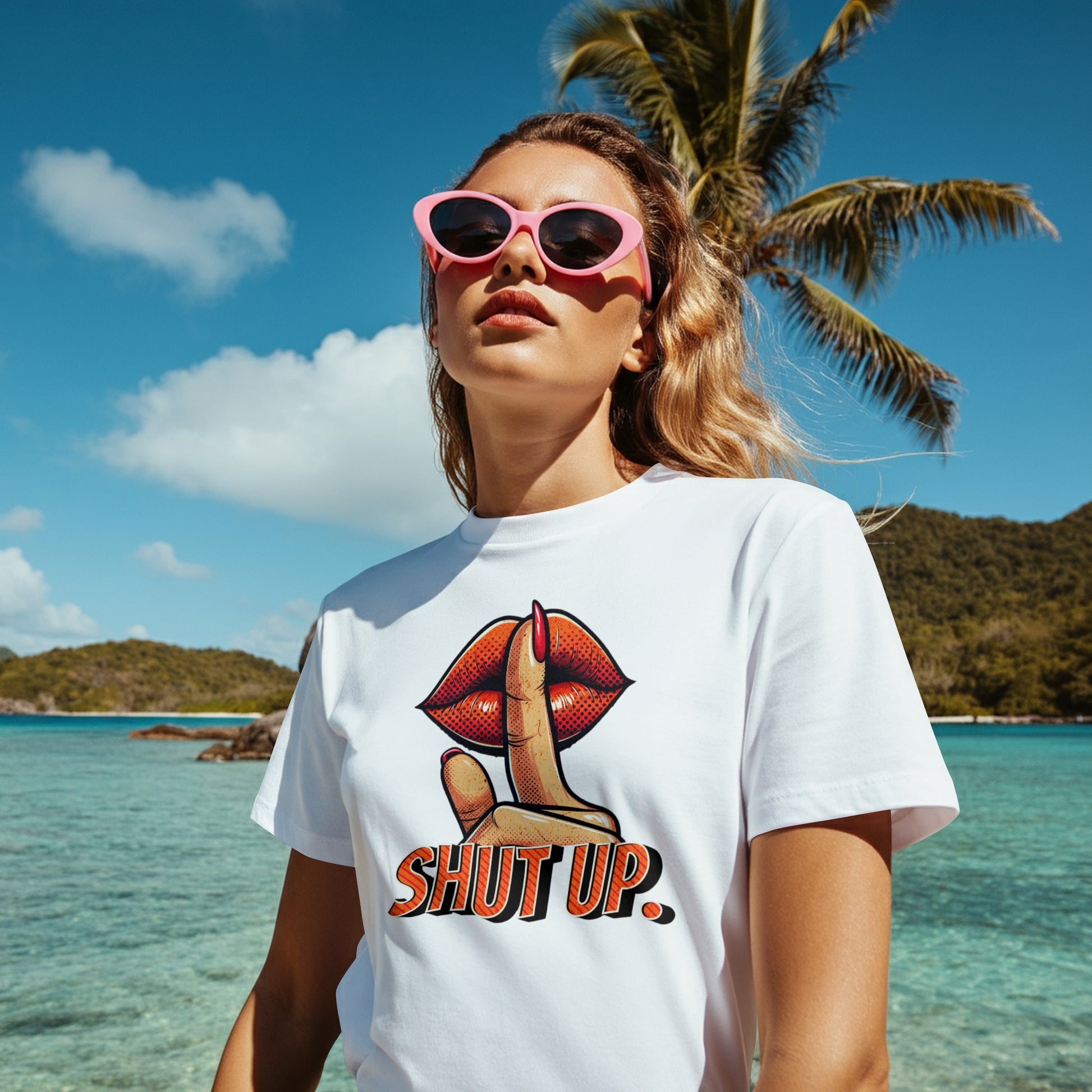 Discover the perfect blend of style and comfort with our Women's "Shut Up" Lips Crew Neck Short Sleeve T-Shirt. Crafted from high-quality heavyweight cotton, this t-shirt is a durable staple featuring a relaxed fit that's ideal for casual outings and summer vibes.