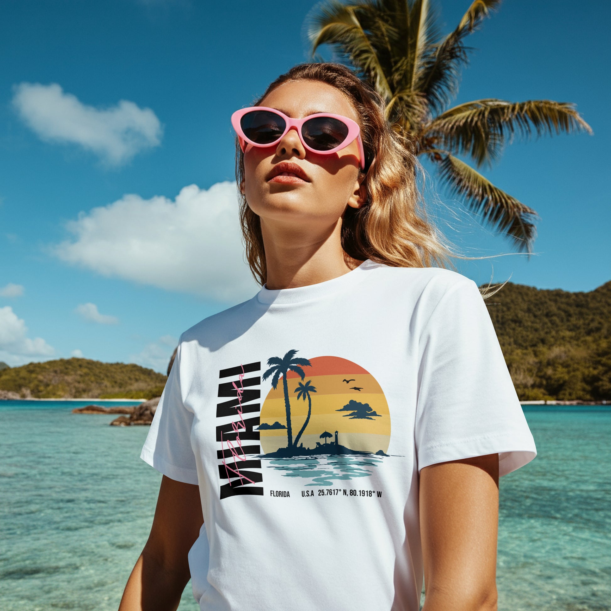 Women's Miami Graphic T-Shirt - Soft Cotton Blend Tee in White, Blue, Grey, Pink, Beige | Sizes S-5XL